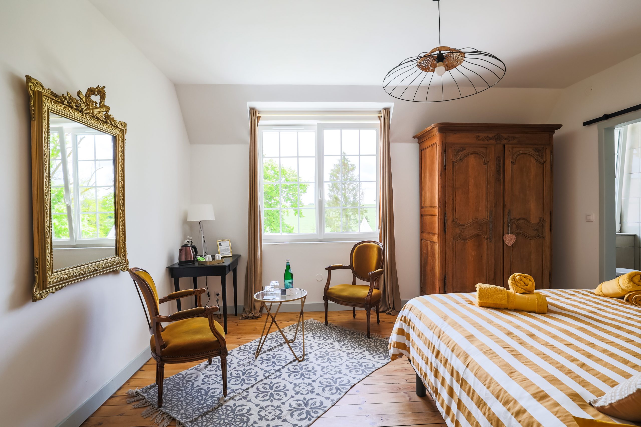 Découvrez cette chambre lumineuse et inspirée par l’audacieux aventurier Michel Ardan. Le coin salon avec deux fauteuils anciens et une table est parfait pour lire ou savourer une boisson chaude, rappelant les discussions passionnées d’Ardan sur ses voyages vers la Lune. Une grande fenêtre laisse entrer une lumière naturelle abondante et offre une vue agréable sur le jardin.