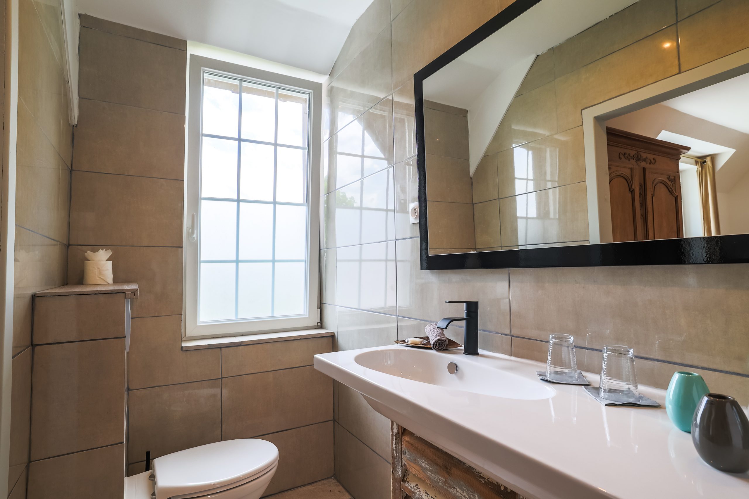 La salle de bain attenante, accessible par une porte coulissante, est équipée d’une douche à l’italienne, d’une vasque avec miroir et de toilettes. La grande fenêtre dans la salle de bain ajoute une touche de luminosité naturelle, évoquant la clarté des étoiles que Michel Ardan aimait tant observer.
